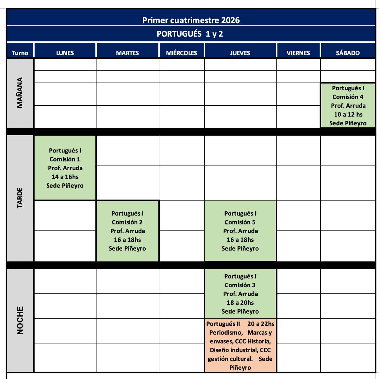 Aquí encontrarás la oferta horaria de portugués I (transversal) y portugués II para Periodismo, CCC historia, CCC Gestión cultural, Diseño industrial y Diseño de marcas y envases.